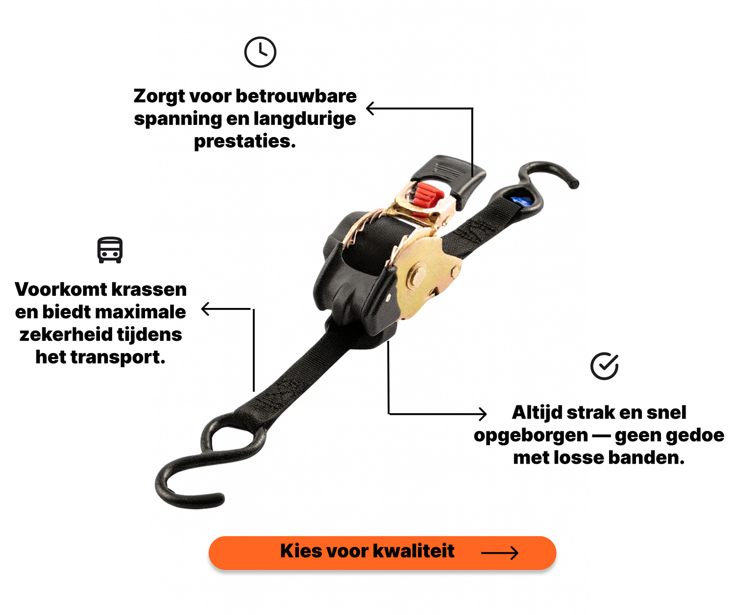 Durch den automatischen Mechanismus lässt sich das Band unglaublich schnell spannen und/oder aufrollen, was beim Be- und Entladen Zeit spart. Mit einer Länge von 1,8 Metern bzw. 3 Metern und einer Breite von 25 mm bieten diese Hijskampioen-Gurte ausreichend Länge und Festigkeit, um eine Vielzahl mittelgroßer Güter sicher zu sichern.